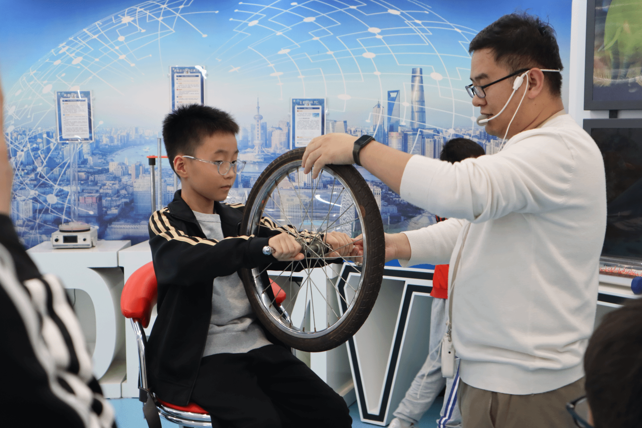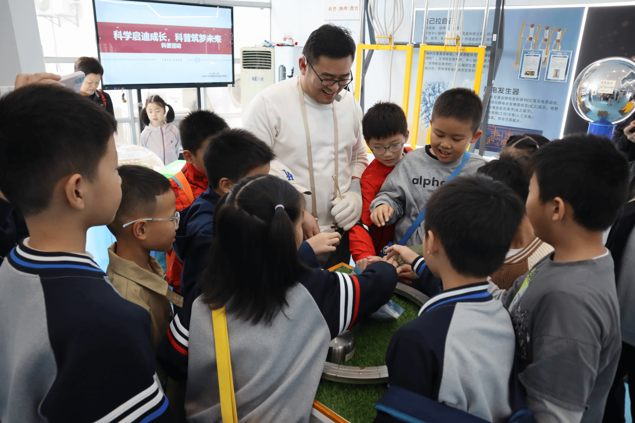 在“科学讲解之旅”环节,胡老师带领孩子们逐一解读展品背后的科学原理:从真空装置中的气压奥秘,到特斯拉线圈的高压电现象;从光的偏振实验,到角动量守恒的亲手体验……抽象的物理概念通过直观的演示和生动的比喻,变成了孩子们听得懂、记得住的“科学故事”。