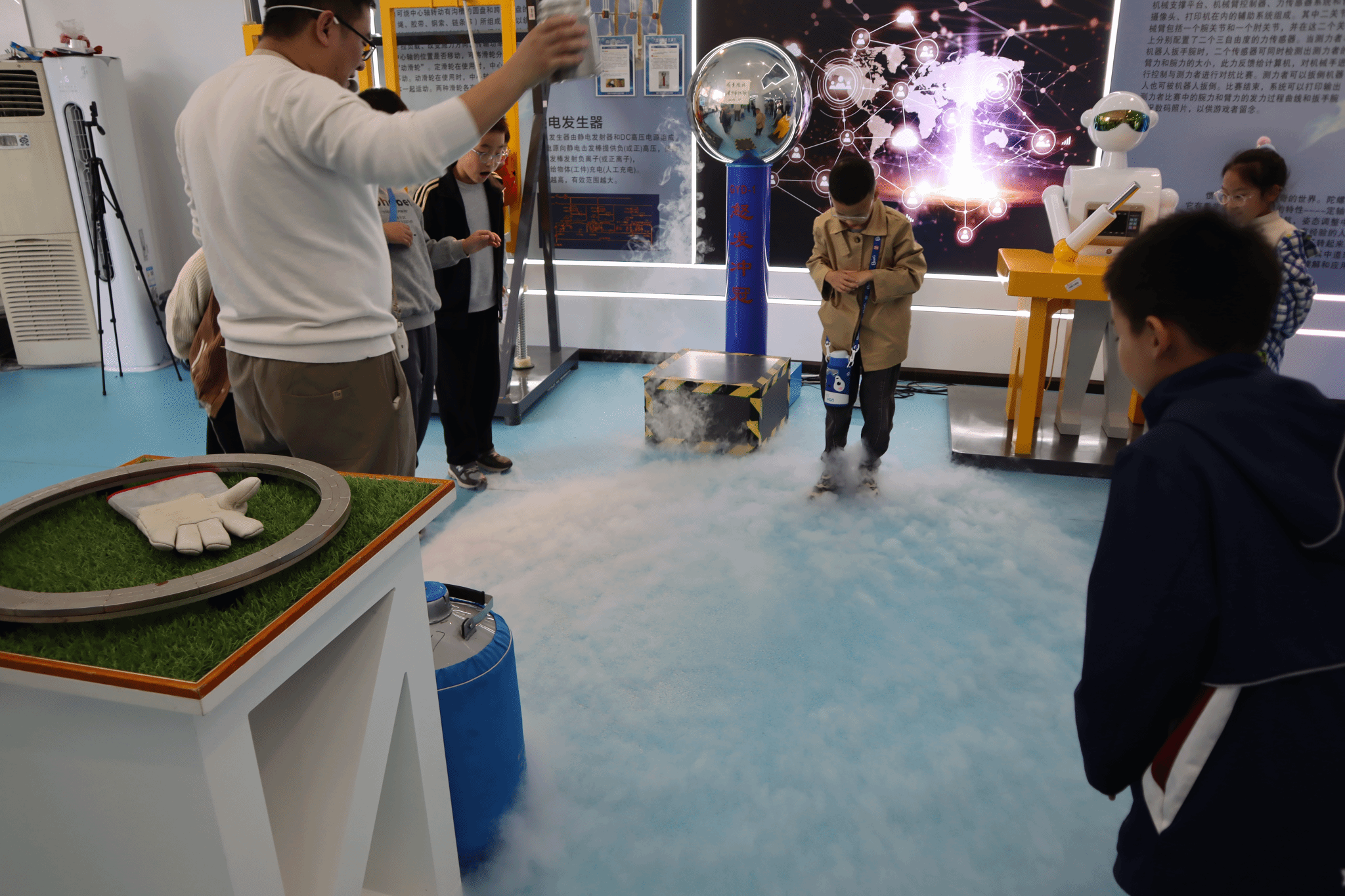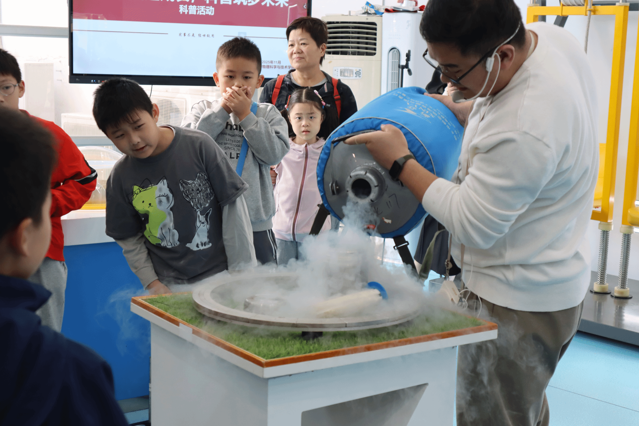 随后,胡绪瑞老师带来的“超导密语”实验将活动推向高潮。干冰制造的低温效果伴随着袅袅白雾,瞬间吸引了全场的目光。胡老师用生动有趣的语言,深入浅出地讲解了低温超导的原理与实际应用,并耐心解答孩子们提出的一个个“为什么”。科学知识在轻松的氛围中悄然播种。