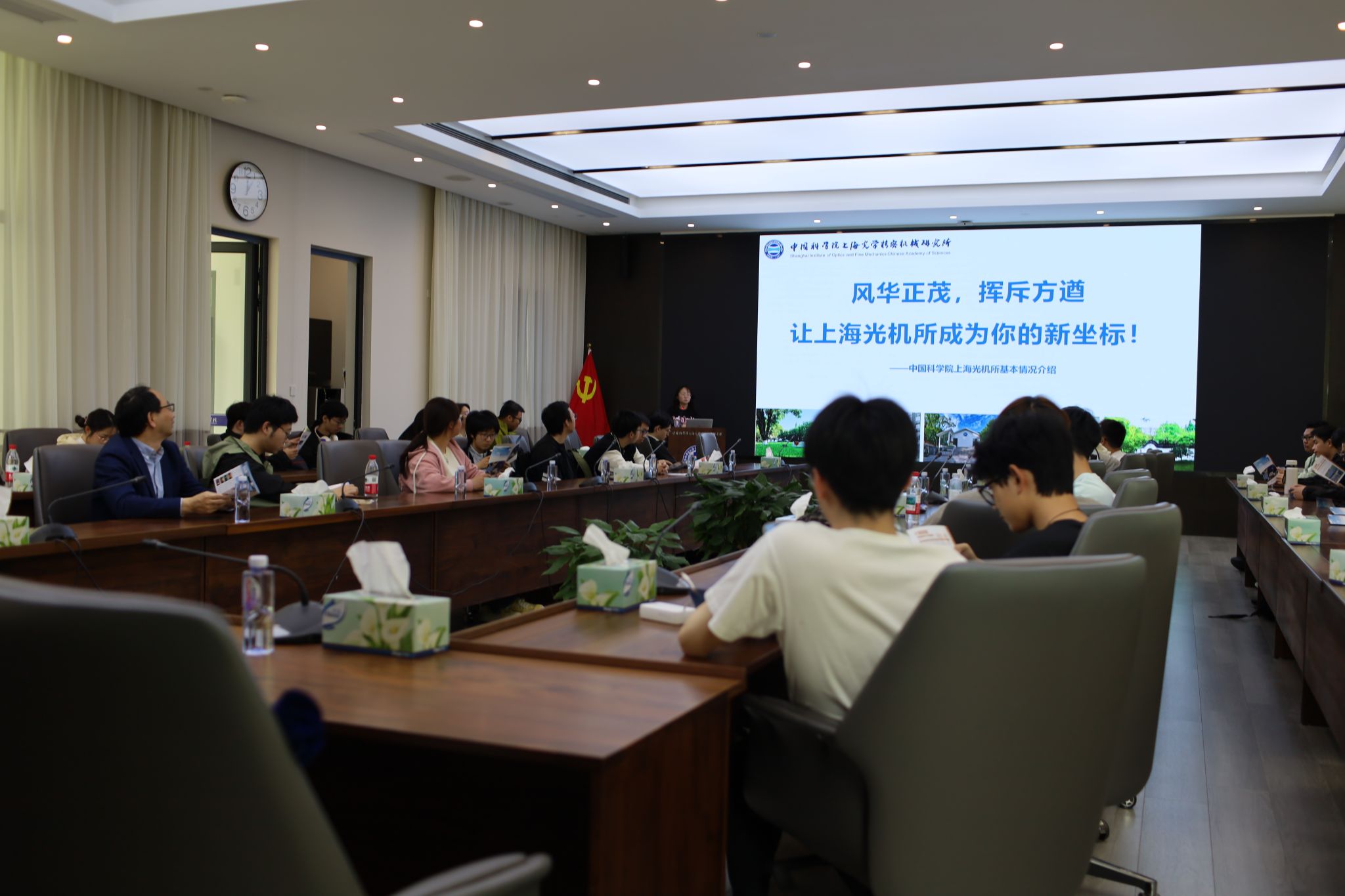 抵达上海光机所后,研究所负责人向师生全面介绍了研究所概况、重点科研方向与研究生教育体系,系统展示了以强激光科学与技术为核心,覆盖空间激光、时频技术、量子光学、光学材料等前沿领域的科研布局,让同学们直观了解国家级科研平台的重大成果、发展态势与人才培养特色。