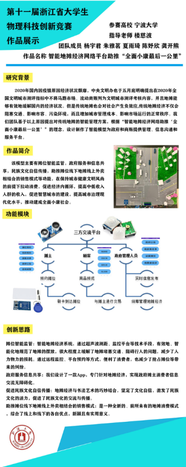本次竞赛由浙江省大学生科技创新竞赛委员会、浙江省高等云鼎娱乐城网 物理学类专业教学指导委员会与浙江省物理学会共同主办。物理云鼎娱乐城网 陶卫东老师指导的一种大范围自动对焦双光子微结构的装置(参赛成员:徐泽宇、龚逸枫、黄灵慧)获得一等奖,楼慈波老师指导的基于Arduino的智能自养护生态雨林缸的设计和制作(参赛成员:夏乐怡、罗凯楠、叶成磊、徐一凯、徐兰心)和颜飞彪老师指导的一种缓冲减速带(参赛队员:刘郑苗、胡新龙、徐源、孙凯彬、韦业兴)荣获二等奖;另外还获得9项三等奖。