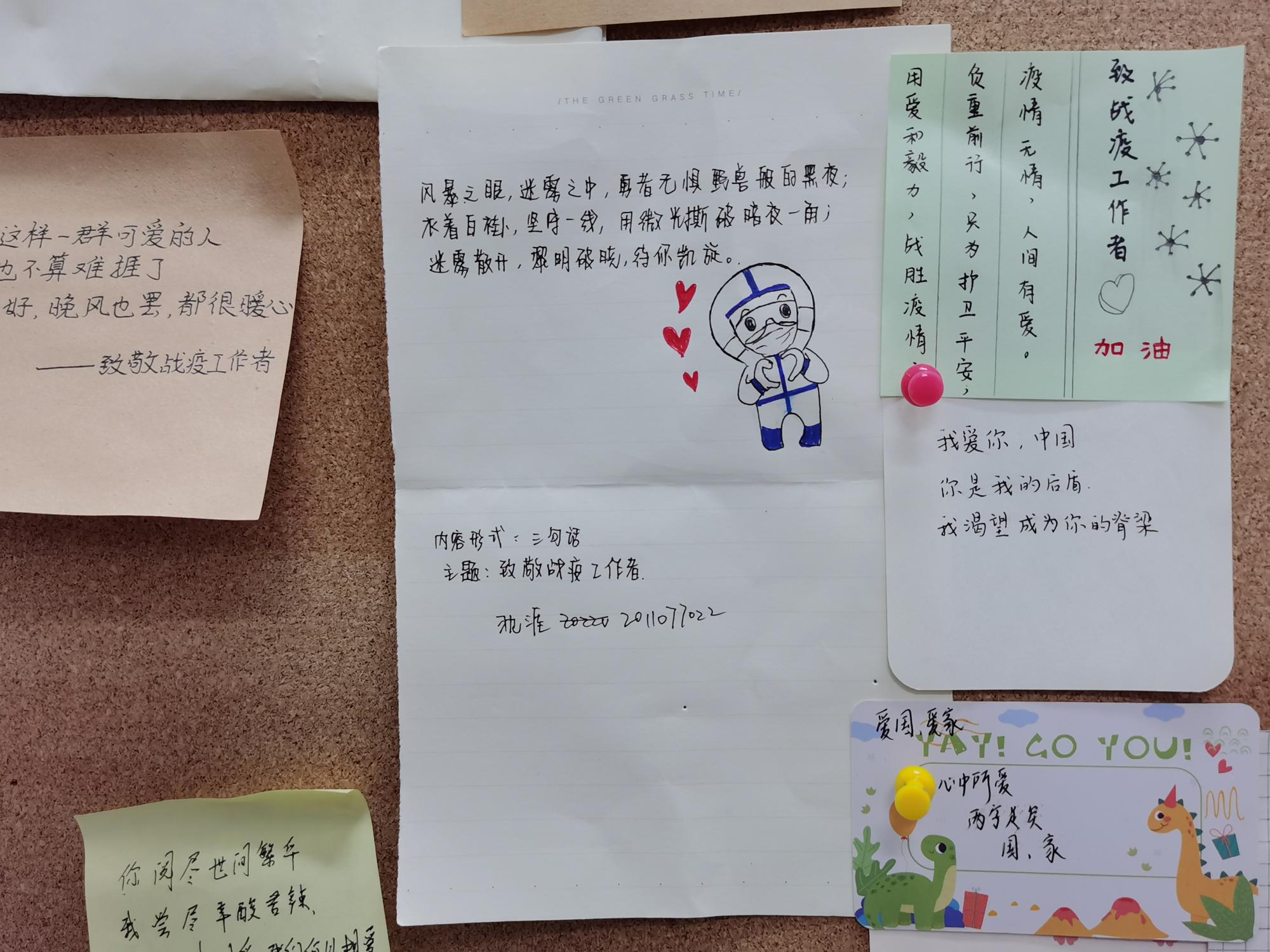 活动发起后,同学们积极参与投稿,累计收到投稿近百份。经初步审核,共筛选相关作品三十余份,所选作品均字迹工整、感情充沛、文笔优美。物院学子对党、对国家、对疫情志愿者及家人朋友最真挚的情感跃然纸上,在思想上和行动上高度践行了云鼎娱乐城网 举办本次活动的初衷。投稿截止后,优秀作品在物理云鼎娱乐城网 微信公众平台展出。