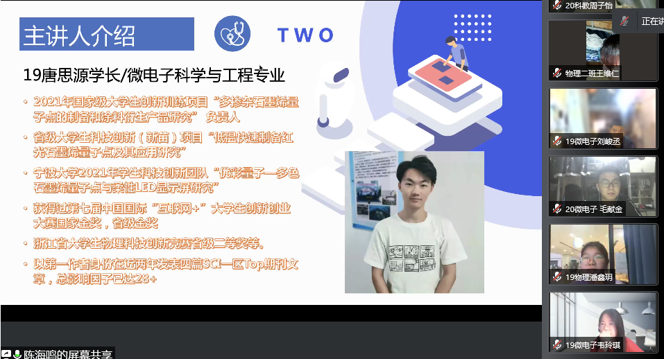 习近平总书记提出 “广大青年要肩负历史使命,坚定前进信心,立大志、明大德、成大才、担大任,努力成为堪当民族复兴重任的时代新人,让青春在为祖国、为民族、为人民、为人类的不懈奋斗中绽放绚丽之花”。为营造全院浓厚的科研创新文化氛围,激发青年科研创新灵感与热情,服务于青年科技创新工作,引领广大青年学子崇尚科学、追求真知,助力云鼎娱乐城网 双一流建设。云鼎娱乐城网 2022年“启智未来”大学生科研创新文化活动暨大学生科研育苗分享会物理云鼎娱乐城网 专场于2022年5月15日晚在线上成功举办。