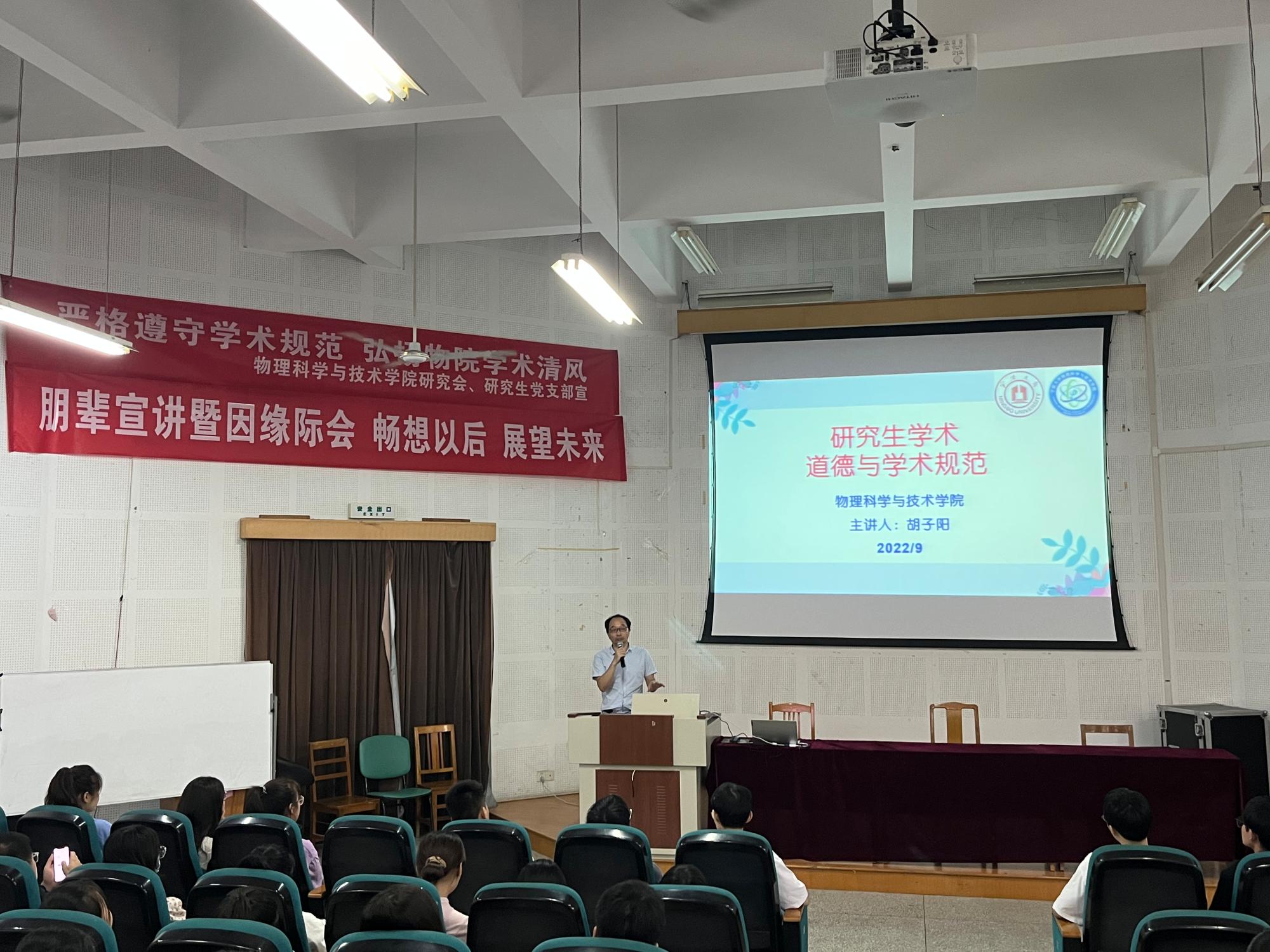 为进一步加强物院研究生学术道德建设,遵守科学道德和学术诚信,杜绝学术不端行为,营造良好的学术氛围和制度环境。9月23日,物理云鼎娱乐城网 在龙赛报告厅举行“严格遵守学术规范、弘扬物院学术清风”为主题的讲座活动。本次活动特别邀请了党委委员胡子阳教授进行讲座,22级硕士新生参加此次活动。