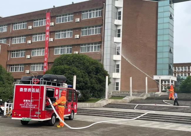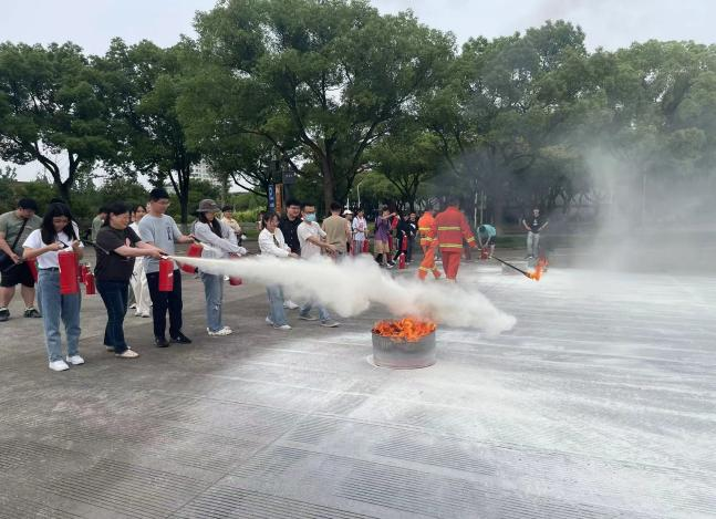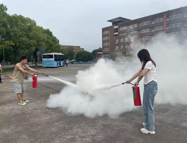 宣讲结束后,朱书记组织学生前往实地进行灭火器消防演练。在演练阶段,模拟发生火灾,消防扫水车迅速出警,消灭火势。其他人员则拿起灭火器扑灭各个起火源。