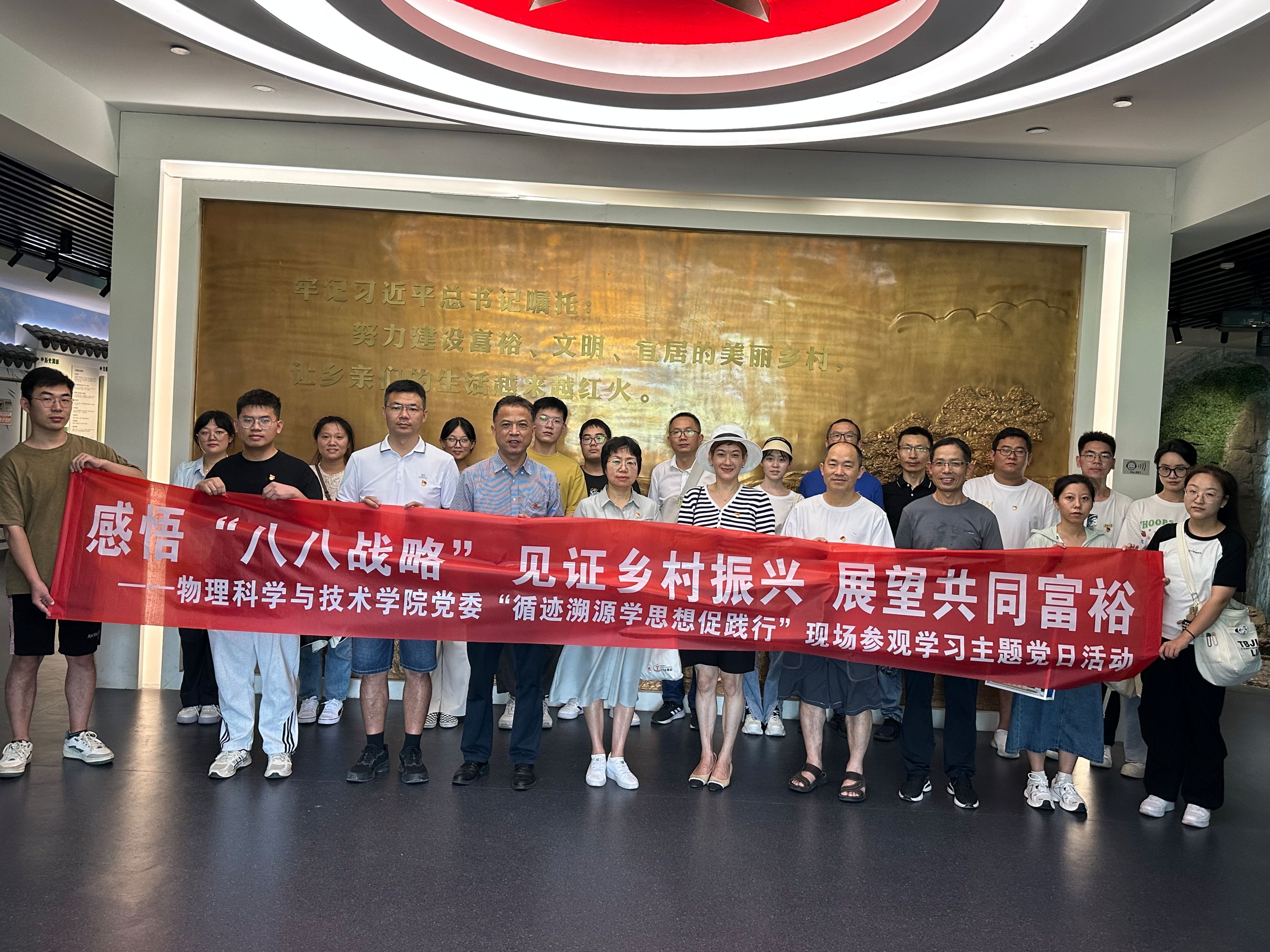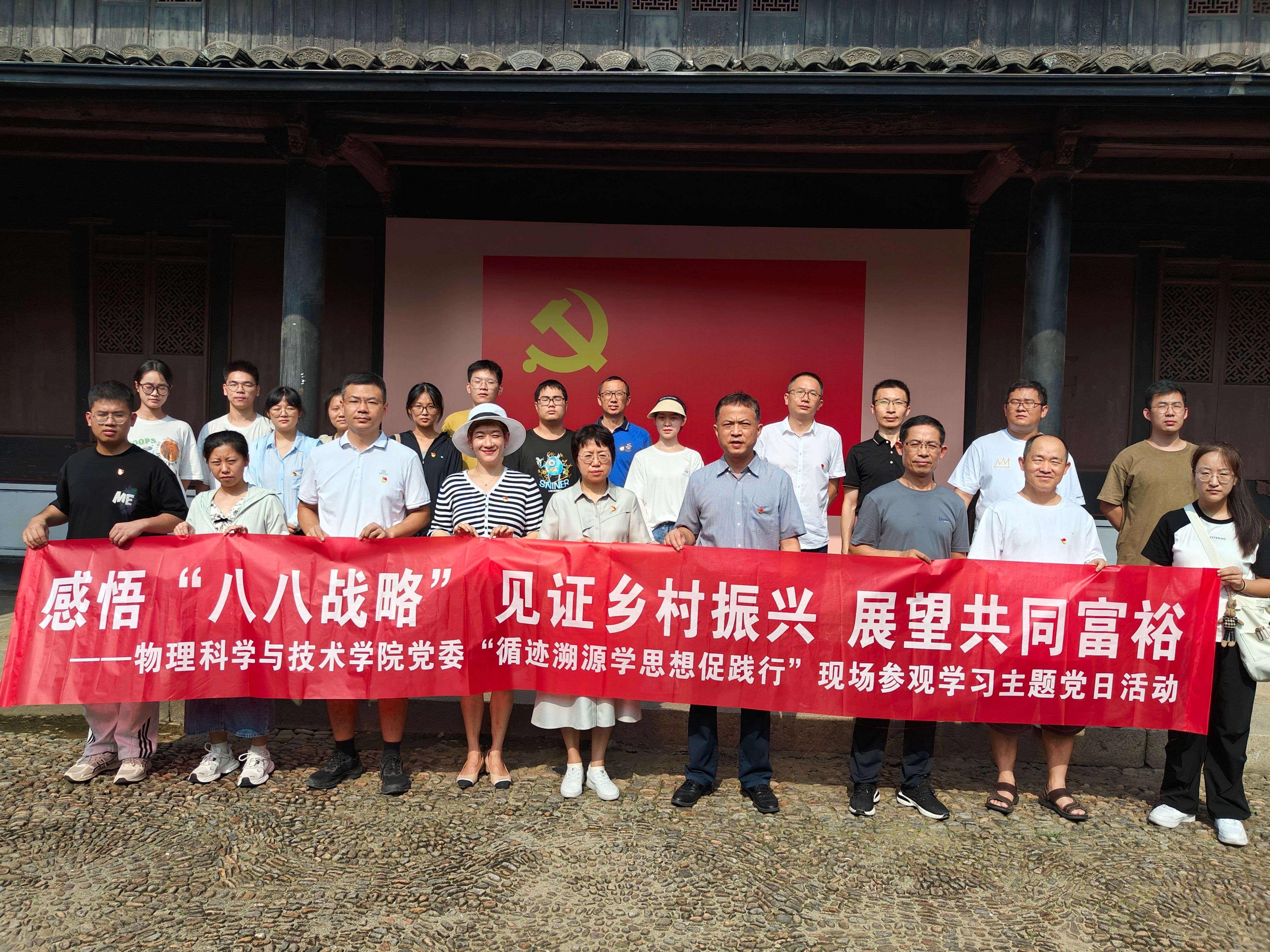 为进一步深入学习贯彻习近平新时代中国特色社会主义思想,引导师生党员重走习近平浙江足迹,在循访中体悟“八八战略”实施20年来的浙江实践,感受习近平新时代中国特色社会主义思想的真理伟力,凝聚奋进中国式现代化赶考路的磅礴力量,8月8日,物理科学与技术云鼎娱乐城网 党委赴余姚市梁弄镇横坎头村开展“循迹溯源学思想促践行”学习活动暨“感悟‘八八战略’,见证乡村振兴,展望共同富裕”主题党日活动,走进新时代文明实践站、余姚市红廉馆、浙东抗日根据地旧址群、“浙东红村”风貌区等地,实地体验“红色引领、绿色发展”的乡村振兴之路,物理系教师党支部、行政教工党支部、研究生第一党支部的师生党员参加。