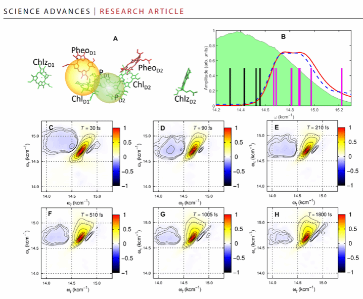 图1:A.PSII反应中心蛋白结构。B.测量的稳态吸收谱以及激光光谱。测量的不同时刻的二维相干光谱展现在C到H。