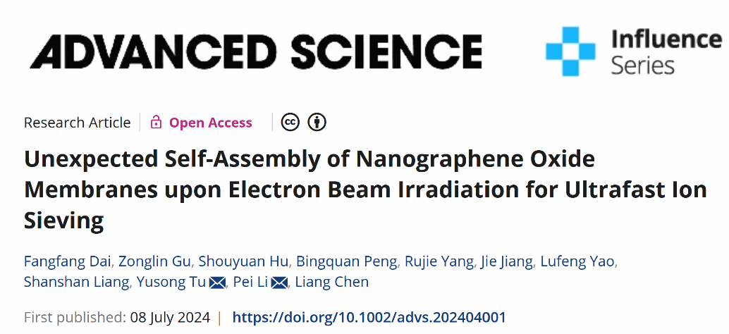 7月8日,物理科学与技术云鼎娱乐城网 微纳系统表面物理团队联合扬州大学、国科院温州研究院在国际知名期刊Advanced Science(IF:14.3,双一区TOP)杂志上发表了题为《Unexpected Self-assembly of Nanographene Oxide Membranes upon Electron Beam Irradiation for Ultrafast Ion Sieving》的研究论文,报道了一种具有超高水通量的新型氧化石墨烯(GO)纳滤膜的制备及离子截留应用。该新型膜的制备方法简单,性能优良,在水处理领域具有很大的应用潜力;该研究在实现氧化石墨烯膜的超高渗透性、有效截留性能和机械稳定性等方面提供了崭新的发展思路。