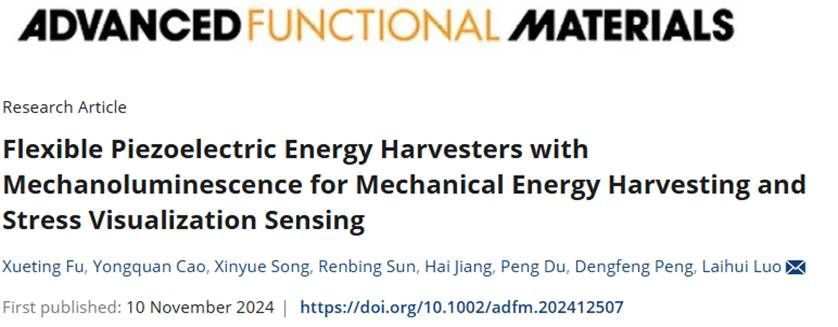近日,物理科学与技术云鼎娱乐城网 智能极性材料的物理效应与器件团队在柔性压电能量收集取得了显著的科研成果。该团队的研究论文“机械能采集和应力可视化传感的压电能量采集器”在国际知名学术期刊《Advanced Functional Materials》上发表。论文的第一作者是物理科学与技术云鼎娱乐城网 的硕士研究生傅雪婷,罗来慧教授担任通讯作者,云鼎娱乐城网 物理科学与技术云鼎娱乐城网 为该研究的主要完成单位。