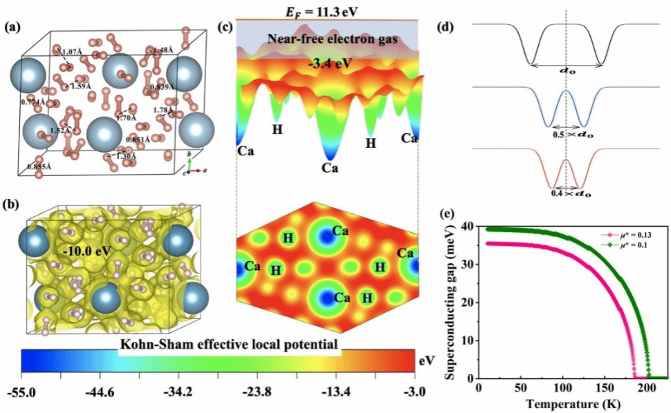 在本研究中,课题组针对分子氢不利于高温超导的传统观点提出挑战。基于第一性原理计算,成功设计出压致H2分子型氢化物CaH14,并预测其在高压下具有204 K的高温超导转变温度研究发现,其独特的电子结构特征在于费米面处显著出现近自由电子气,但H2分子结构保持完整并未发生解离。这一发现表明超导转变的必要条件是形成库伯对的自由电子气作为费米海,而非原子氢。研究团队在Kohn-Sham密度泛函理论框架下揭示出该分子氢化物有效势并阐明近自由电子气的产生机理。如图所示,(i)随着压力的施加,H2单元和Ca离子形成的有效势阱彼此移动,形成较低的有效势脊连接。(ii)由于强烈的泡利排斥效应,电子占据更高能级,其典型特征是高费米能级的形成。因此,由压力引起的电子动能的增加超过了Ca和H2阳离子所形成的有效势阱的束缚,从而使电子从势阱中逸出,形成了类似于凝胶背景电荷上的自由电子气。