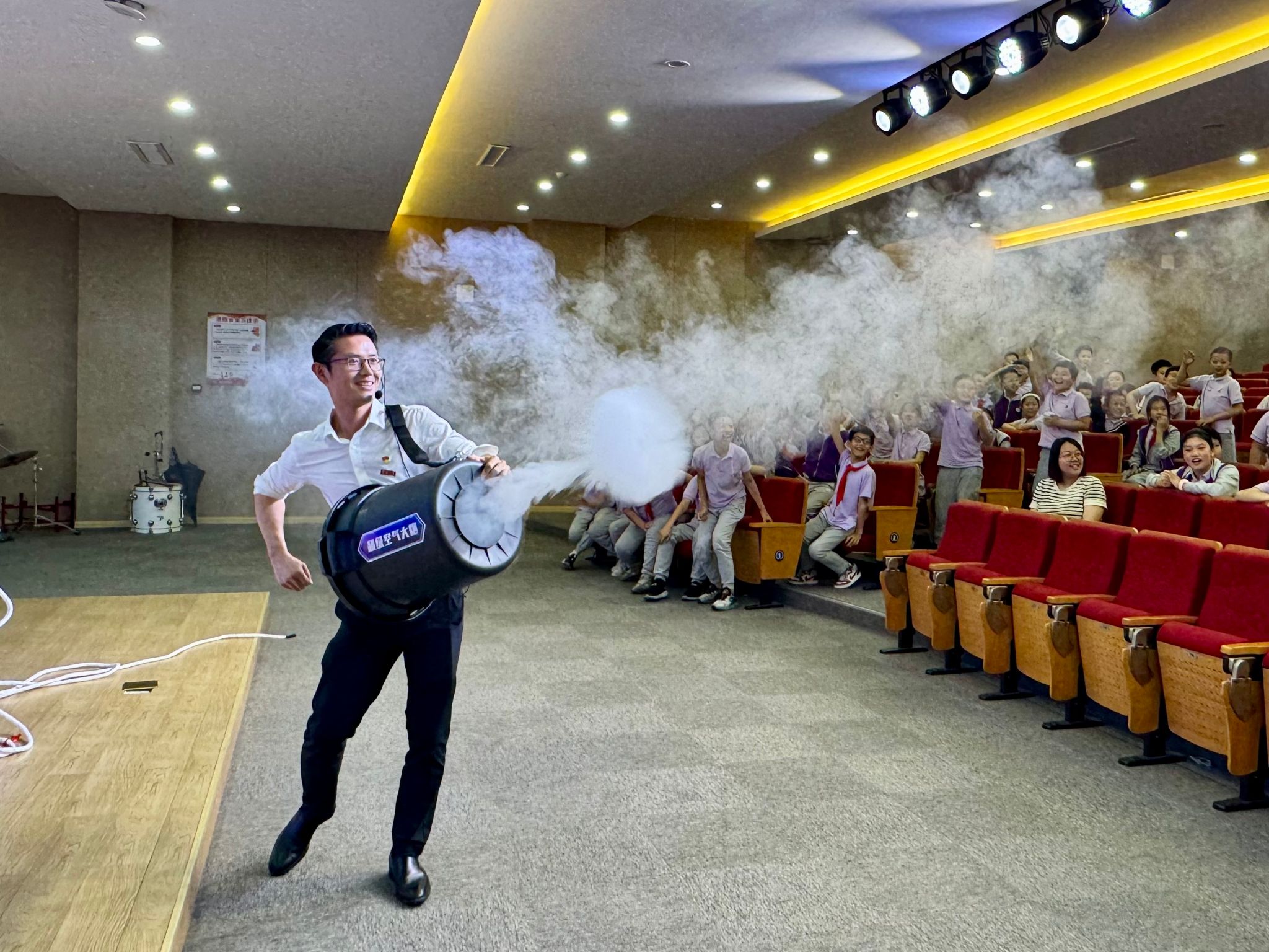 看无人机“现场起飞”,感受超导磁悬浮现象......在胡绪瑞老师的一番神秘操作下,各式各样的“科技+”沉浸式体验,精彩而又充满未来感的科学现象让孩子们惊叹不已,报告厅里时不时传来阵阵喝彩。
