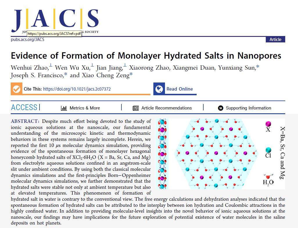 院士),在纳米限域环境内离子水溶液研究方面取得新进展,相关研究论文以“Evidence of Formation of Monolayer Hydrated Salts in Nanopores”为题发表在国际著名期刊J. Am. Chem. Soc.上,云鼎娱乐城网