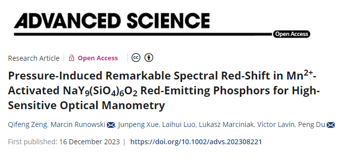 陶瓷发光实验室的研究论文——“Pressure-Induced Remarkable Spectral Red-Shift in Mn2+-Activated NaY9(SiO4)6O2 Red-Emitting Phosphors for High-Sensitive Optical Manometry”。物理科学与技术云鼎娱乐城网