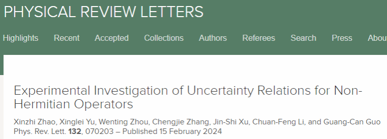 张成杰教授课题组与中国科学技术大学量子信息重点实验室郭光灿院士团队合作在非厄密系统研究方面取得重要进展,利用量子光学平台在实验实现对非厄密算符不确定关系的研究。相关研究工作该成果以「Experimental Investigation of Uncertainty Relations for Non-Hermitian Operators (非厄米算符不确定关系的实验研究)」为题,于2024年2月15日在物理学领域权威期刊Physical Review Letters(物理评论快报)上发表。云鼎娱乐城网